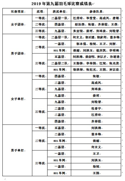 场上队员聚精会神、拼尽全力,场下观众掌声不断、欢呼雀跃,充分展现了公司员工奋勇争先、努力拼搏的精神面貌。经过激烈的比拼,张敏、刘洪涛一路披荆斩棘、过关斩将,分别获得女子单打一等奖和男子单打一等奖;男子团体一等奖和女子团体一等奖分别被二基层男子一队、二基层女子一队收入囊中。